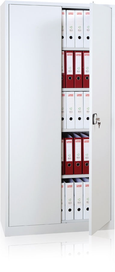 Armoire monobloc équipée de 2 tablettes (H.100 cm) ou 4 tablettes (H.195 cm). - Réglage des tablettes au pas de 50 mm. - Partie haute de l’armoire et tablettes équipées pour recevoir des dossiers suspendus. - Poignées encastrées - serrure 2 points munie de 2 clés.
