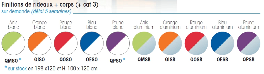 Armoires à rideaux monoblocs « classiques » PVC non feu M1 cat. 1 et 2 ou « Fun » PVC non feu M2 cat.3. 2 tablettes (H.100 cm) ou 4 tablettes (H. 198 cm) de finition noire équipées pour recevoir des dossiers suspendus. Partie haute équipée d’une tablette fixe pour dossiers suspendus. Fond plat facilitant l’extraction des charges lourdes. Serrure fournie avec 2 clés dont une pliante. 4 vérins de réglage.
