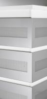 - Voiles de fond structurels mélamine blanc neige ép. 19 mm recouvert de panneaux frontaux superposés en mélamine ou en tôle métallique micro-perforée.