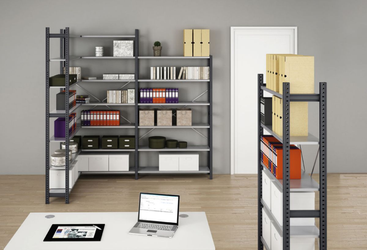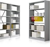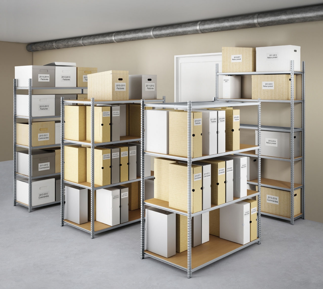 - 6 tablettes largeur 90 ou 120 cm, réglables au pas de 25 mm, permettant l’accrochage de dossiers suspendus.