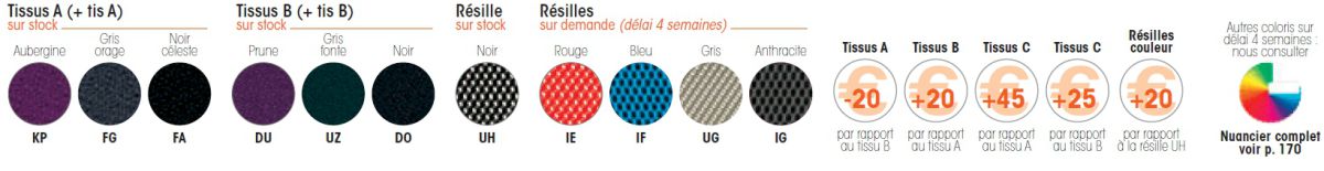 - Système anti-retour du dossier, dossier résille fixe et dossier tissu réglable en hauteur par crémaillère (course de 7 cm).
