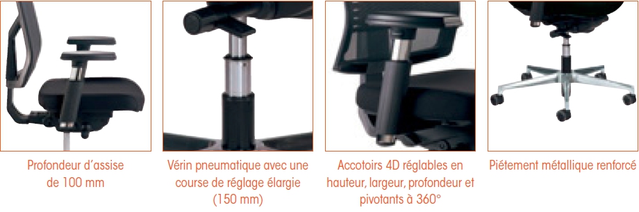 - Réglage de la profondeur d’assise plus large (course de 10 cm).
