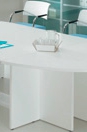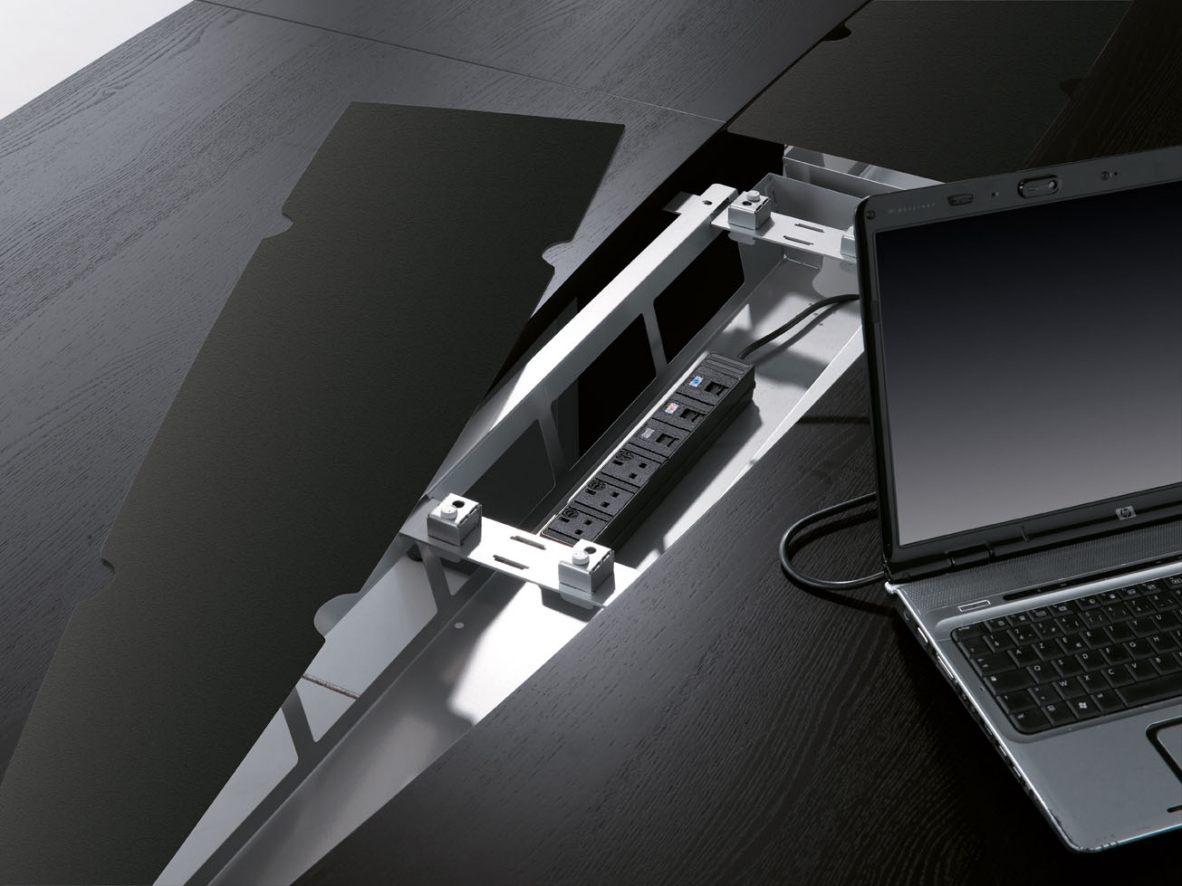 Les tables elliptiques peuvent être équipées d’une goulotte d’électrification centrale avec top access amovible pour le dégagement des câbles et le stockage des boîtiers prises.
