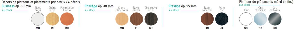 - Piétements panneaux mélamine ou ébénisterie assortis aux plateaux des offres