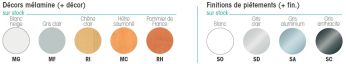 - Plateaux mélamine ép. 19 mm, chants droits ABS ép. 2 mm.
