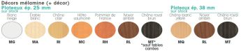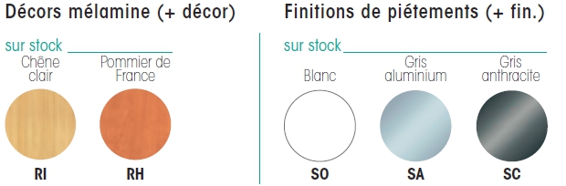 - Plateaux mélamine ép. 25 mm, chants droits ABS ép. 2 mm.